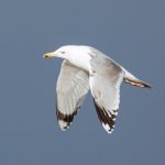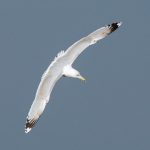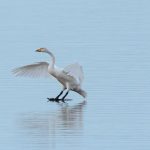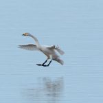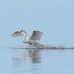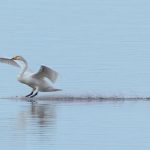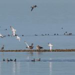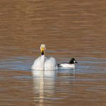 Leider waren bei dann schönstem Fotolicht in der Hirschauer Bucht nur wenige Wasservögel und keine Greifvögel unterwegs. Ein vereinzelt ankommender Singschwan legte eine mustergültige Landung hin und akzeptierte dann bei der Nahrungssuche einen Schellentenerpel als Begleiter, der das von dem gründelnden Schwan auf gestrudelte Plankton erntete. Mehre Steppenmöwen kreisten Nahrung suchen über der Bucht. Durch den fallenden Wasserstand im See tauchten Steinbuhnen und Kiesbänke als Futterspender im Flachwasserbereich der Bucht wieder auf, die von zahlreichen Brachvögeln, eifrig mit dem langen Schnabel nach Fressbarem stochernd, aufgesucht wurden.