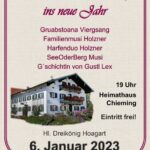 „Alpenländische Volksmusik, Lieder und G´schichtn zum zualos`n“, heißt es beim Hl.Dreikönig Hoagart am Freitag, 6. Januar 2023 um 19 Uhr im Gewölbesaal des Heimathauses Chieming. Nachdem 2020 noch das 25jährige Jubiläum des Sänger- und Musikanten Hoagarts gefeiert werden konnte, freuen sich die Organisatoren, dass nun die Tradition nach der Pandemie bedingten Pause, wieder fortgeführt werden kann.