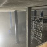 Nachdem die Betonoberfläche mittels Hochdruckwasserstrahl freigelegt wurde und festgestellte Risse sowie Dehnfugen vorbehandelt wurden, folgt nun die Neubeschichtung durch das Auftragen des mineralischen Mörtels an die Oberflächen. Bei der aufwändigen, von Hand auszuführenden Beschichtungsarbeit liegt das Augenmerk auf eine ausreichende und gleichmäßige Schichtdicke. Die Decke wurde mit einer Tropfenstruktur ausgestaltet, um die Oberfläche zur Kompensation des Kondenswassers zu vergrößern.