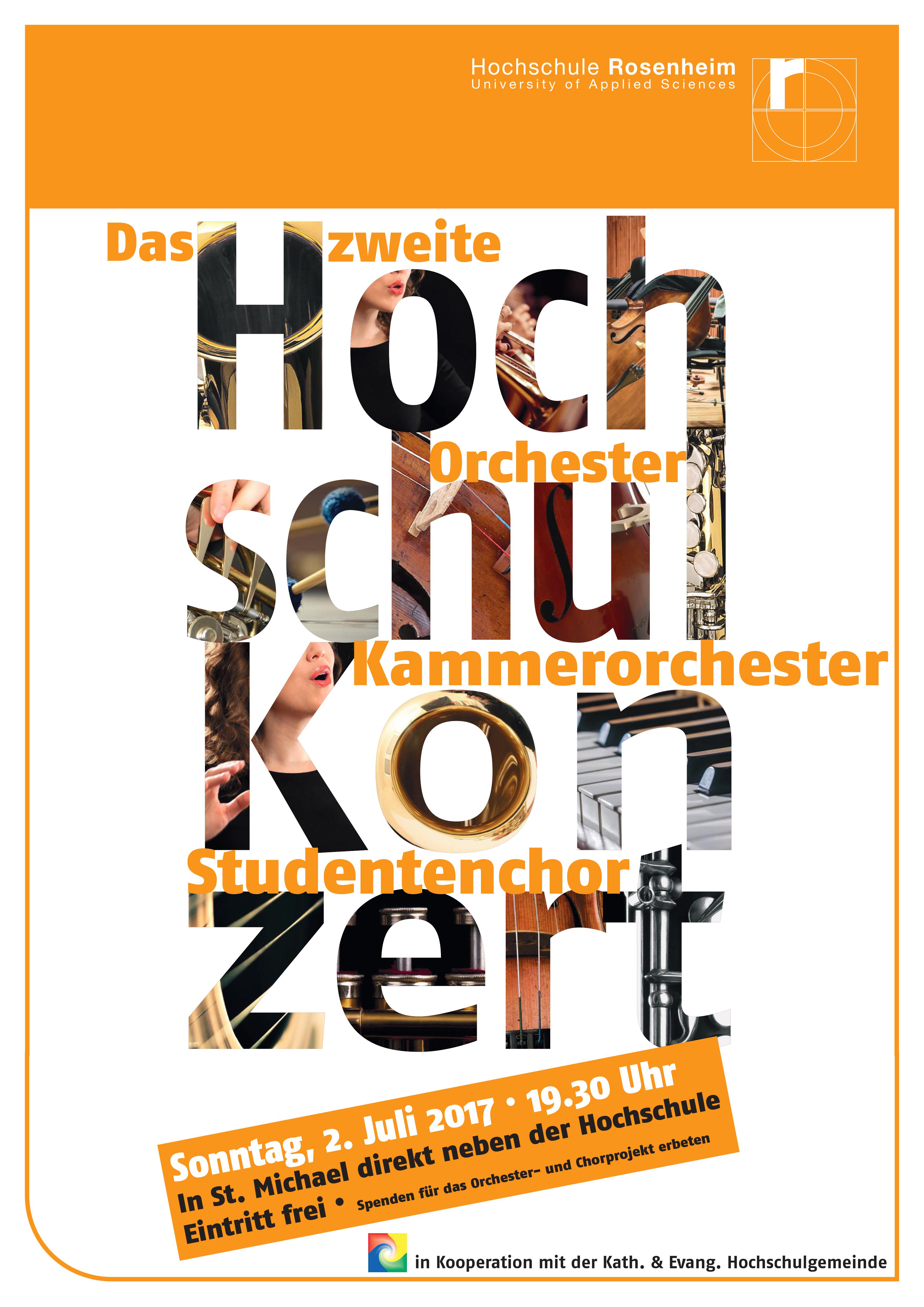 Fünfzig Studentinnen und Studenten, Mitarbeiterinnen und Mitarbeiter der Hochschule sowie Professorinnen und Professoren spielen im Hochschulorchester, im Kammerorchester und singen im Studentenchor der Hochschule Rosenheim. Dieses Kooperationsprojekt der Hochschule mit der katholischen und evangelischen Hochschulgemeinde wurde vor 3 Jahren ins Leben gerufen. Karl-Heinz Lehner, Leiter der katholischen Hochschulgemeinde, ergriff damals die Initiative und brachte das Projekt ins Laufen. „Musizieren ist Bildung für Kopf, Herz und Hand und das Konzert ein kultureller Beitrag der Hochschule für die Stadt Rosenheim“, darüber sind sich der Präsident der Hochschule Heinz Köster und Lehner einig.