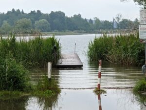 In Prien gibt es nur an vereinzelten Stellen leichtes Hochwasser, so z.B. ein Aufstau am Stettener Bach. Der Parkplatz beim Polizeisteg ist überschwemmt und ein Gully im Forellenweg kurz vor der Polizei präsentiert sich als Springbrunnen.