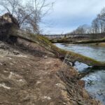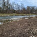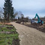 Je mehr Platz das Flussbett der Alz bietet, umso besser für den Hochwasserschutz. Deshalb wird das Ufer in der Pechlerau aufgeweitet, was zunächst eine Verlegung des dort verlaufenden Weges notwendig machte. Er ist nun zurückversetzt in Richtung Wohnbebauung und in Teilen neu angelegt. In einem nächsten Schritt graben Bagger Steine, Kies, Wurzeln und anderes Material aus der Uferzone aus. Das Gelände wird abgeflacht. Es entsteht eine breite Fläche, in die das Wasser bei Hochwasser abfließen kann. Der Kies wird sofort weiterverwendet. Mit ihm wird ein, bis zu einem Meter hoher Hochwasserdamm geschüttet. Er verläuft, entlang der Bebauung, vom Bolzplatz bis zum Ende der Pechleraustraße. Der Kies wird verdichtet, mit Oberboden bezogen und dann bepflanzt.