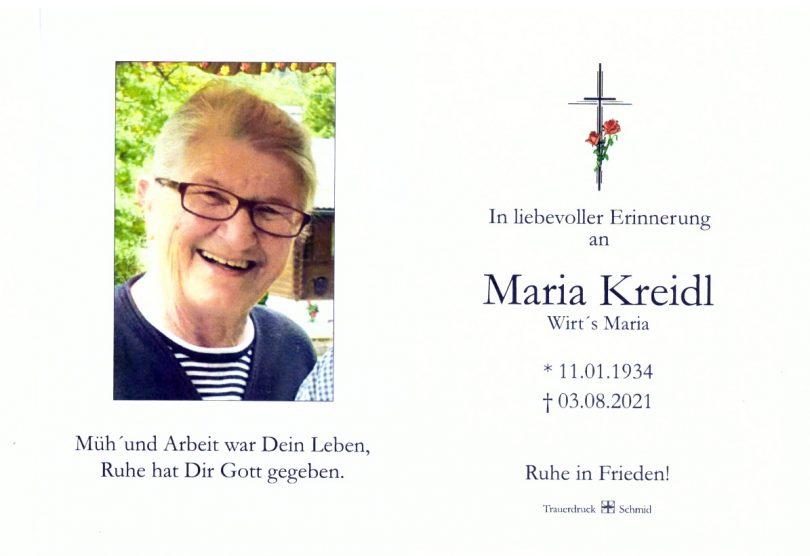 „Die Dorfgemeinschaft von Höhenmoos hat mit dem Tod der Wirtin vom Gasthaus Kreidl ihre Mitte verloren“ – mit diesen Worten sprach Pfarrer Robert Baumgartner jedem Einzelnen der großen Trauerschar aus dem Herzen, die sich zur Verabschiedung und Beerdigung von Maria Kreidl am Leichenhaus und im Friedhof eingefunden hatten. Nach kurzer Krankheit und Aufenthalt im Pflegeheim (und ehemaliger Gaststätte) Mangst in Törwang verstarb die Wirtin mit Leib und Seele im Alter von 87 Jahren.