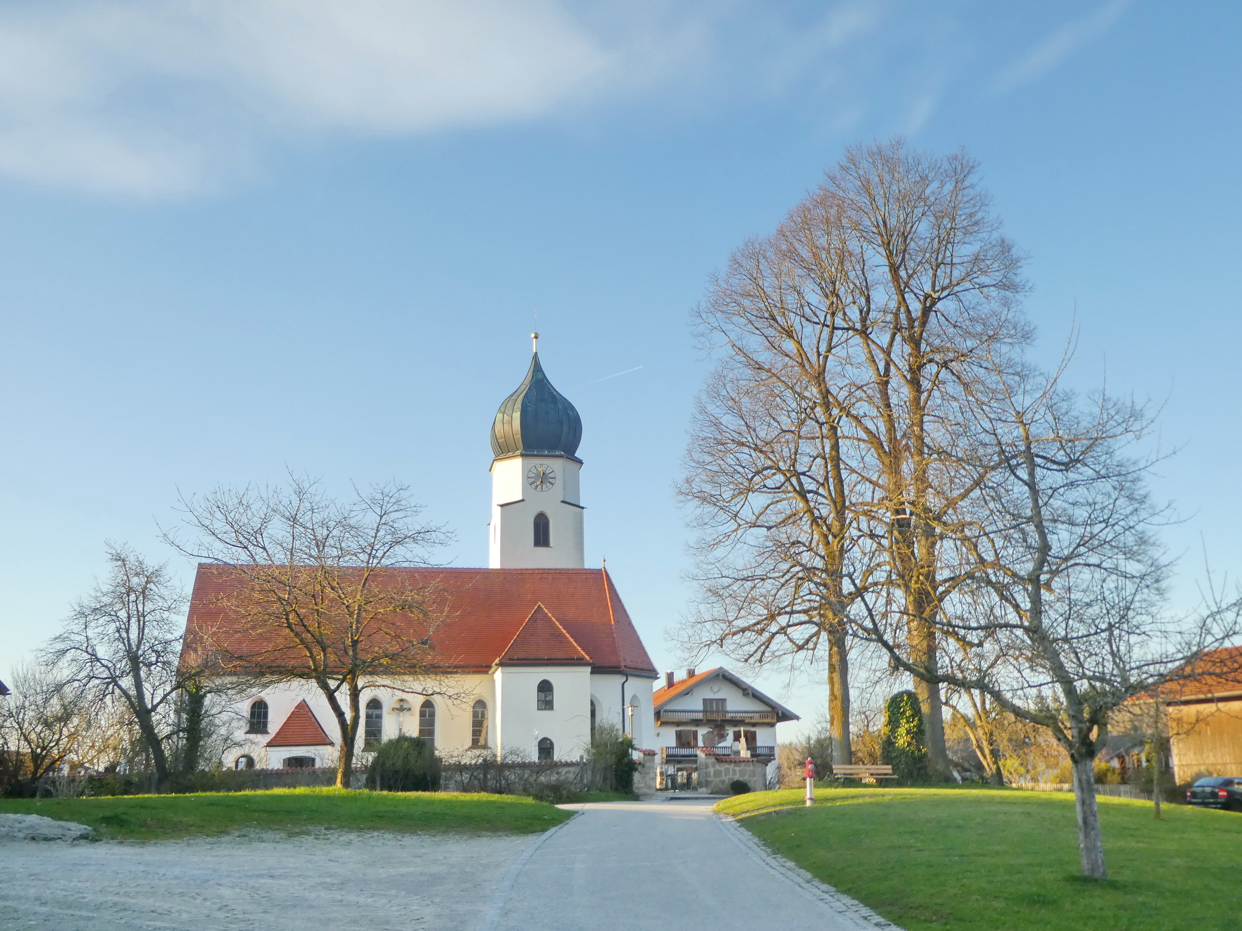 In ganz besonders herrschender Lage zwischen Chiemsee, Simssee und Samerberg und nahe der Autobahn-Ausfahrt Achenmühle thront die Pfarrkirche St. Peter und Paul in Höhenmoos. Seit 2010 ist die Pfarrei Höhenmoos in den Pfarrverband Rohrdorf eingegliedert. Unsere aktuelle Aufnahme entstand im Licht der abendlichen Frühjahrssonne und zeigt die Kirche mit dazugehörigem Pfarrhof sowie mit prägenden Bäumen, die derzeit blattfrei noch eine ganze Durchsicht auf des Gotteshaus ermöglichen.