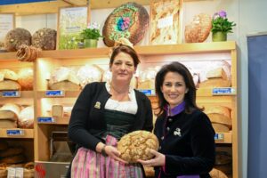 Nach zwei Jahren Coronapause präsentiert sich der Freistaat Bayern in diesem Jahr wieder auf der Internationalen Grünen Woche in Berlin als Land der Genüsse. In der großen Bayernhalle – seit vielen Jahren der Besuchermagnet schlechthin – zeigen über 50 Aussteller den Besucherinnen und Besuchern, was der Süden Deutschlands an kulinarischen Spezialitäten und als gastfreundliche Urlaubsregion zu bieten hat. Bei ihrem Rundgang durch die Bayernhalle hat Agrarministerin Michaela Kaniber auch am Stand der Ludwig Stocker Hofpfisterei aus München vorbeigeschaut. Die Traditionsbäckerei hat sich auf Ökobauernbrot spezialisiert. Die Ministerin probierte von der Pfister-Sonne, ein Aushängeschild in der breiten Palette der Münchner Bäckerei, die auch in Berlin Filialen betreibt.
