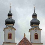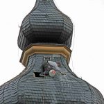 Durch das Priental fegen immer wieder heftige Stürme. Die Windgeschwindigkeiten erreichen gerade in luftiger Kirchturmhöhe Spitzengeschwindigkeiten. Das führt dazu, dass die Schieferplatten der doppeltürmigen kath. Pfarrkirche „Darstellung des Herren“, durch diese starken Kräfte angehoben und aus der Verankerung gerissen werden. Die Firma Wachter aus Grassau repariert gerade den letzten Sturmschaden und nutzt die Gelegenheit gleich, die Hinterlassenschaften des Turmfalken auf den Zwiebeltürmen zu beseitigen.