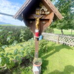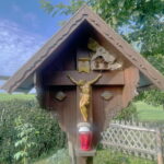 Das Feldkreuz mit dem Corpus Christi hat Helmut Rosenwink (82) zu seinem 50. Geburtstag erhalten. Geschaffen wurden beide vom Unterwössener Künstler Andreas Kuhnlein. „In all den Jahren haben wir es noch nie gesehen, dass sich Hornissen einen solch besonderen Platz ausgesucht haben“ – so die Familie Rosenwink beim Betrachten des Feldkreuzes.