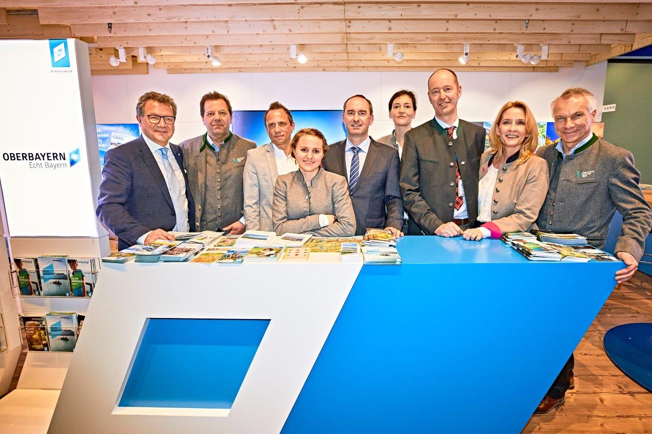 Gruppenbild mit Staatsminister Hubert Aiwanger vor dem ITB-Stand des Tourismus Oberbayern München (TOM) e.V.