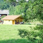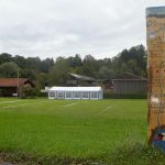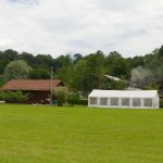 Fotos: Hötzelsperger – Blick auf den Hufeisen-Wurfplatz in Prien-Kaltenbach mit Darstellung der zukünftigen Überdachung für den Trainingsplatz – zum Teil mit dem Festzelt als Größenvergleich, das bei den traditionellen und internationalen Hufeisenwettbewerben aufgestellt wird.