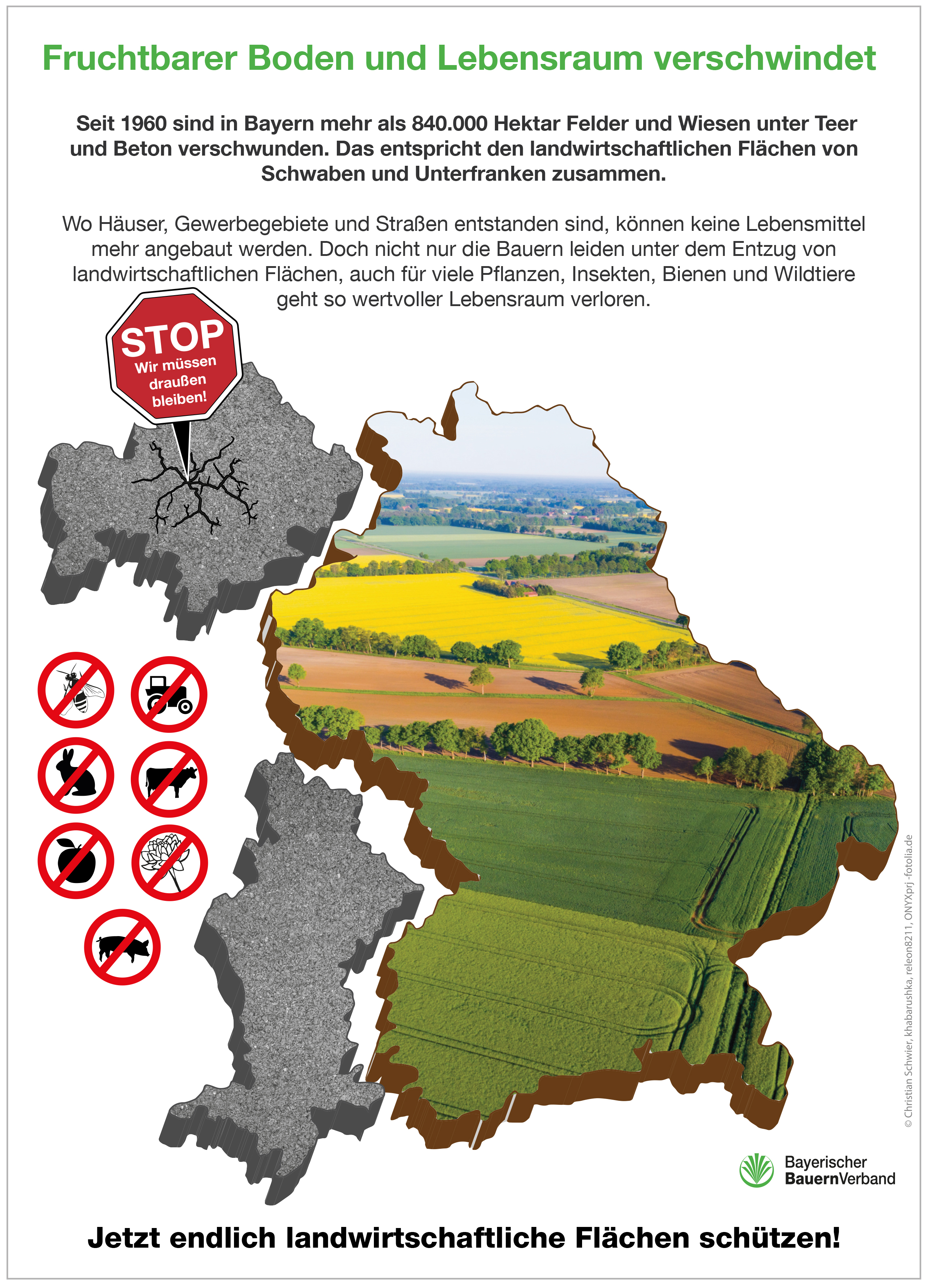 Die aktuellsten Zahlen des Statistischen Landesamtes zeigen: der bayerischen Landwirtschaft sind 2016 insgesamt 3.581 Hektar verloren gegangen sind. Seit 1960 sind in Bayern mehr als 840.000 Hektar Felder und Wiesen verschwunden. Das entspricht der gesamten Acker- und Wiesenfläche von Schaben und Unterfranken zusammen. Das zeigt eine Grafik des Bayerischen Bauernverb„Auf diesen Flächen können keine Lebensmittel mehr angebaut werden. Auch als Lebensraum für viele Pflanzen, Insekten, Bienen und Wildtiere sind sie verloren“, sagt Heidl.