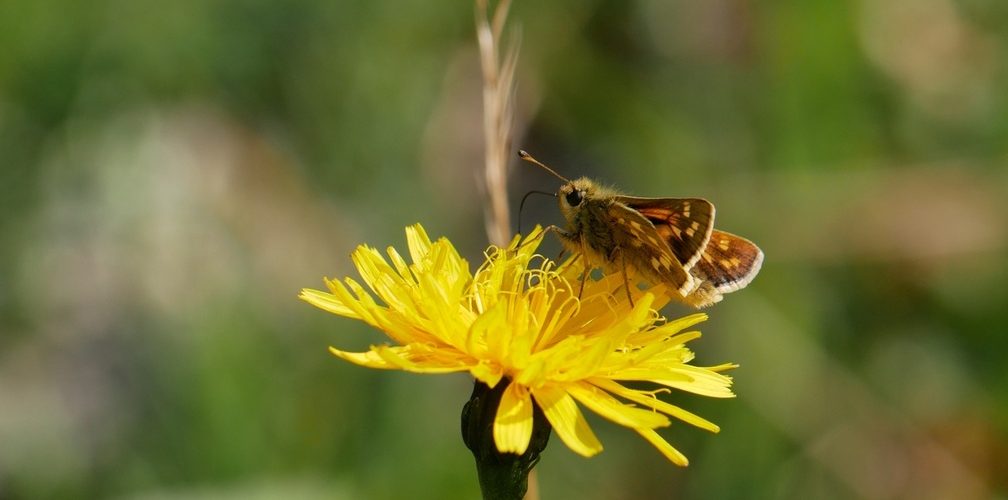 Unten im lichten Wald gab es zuerst einmal die ersten Orchideen zu beobachten, den Ständelwurz. Bei einem Doldenblütler fiel mir eine lustige Insektenmischung aus Hummel und Käfer auf, den sogenannten Pinselkäfer. Dieser besitzt eine Hauptverbreitung in den Alpen und ist sonst eher selten anzutreffen. Auf den Almen blüht derzeit wunderbar die weiße Fetthenne, welche auch auf dem kahlen Stein ansiedeln kann. Die Almwiesen sind von vielen Schmetterlingen bevölkert, u.a. Dickkopffaltern.