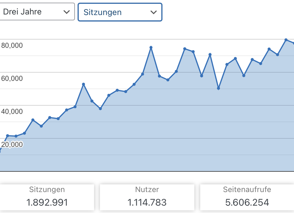 Die Entwicklung der Seitenaufrufe und Sitzungen für diese Webseite in den letzten drei Jahren (jeder Punkt steht für einen Monat der letzten 36 Monate):