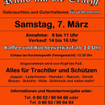 Am Samstag, 7. März dreht sich in der Lamstoahalle alles rund um die Tracht, Gebrauchtes und Gut-Erhaltenes wird für Jedermann angeboten. Die Annahme von Trachtenstücken erfolgt von 9 Uhr bis 11 Uhr, der Verkauf (auch von Kaffee und Kuchen) ist dann von 14 Uhr bis 16 Uhr. Angenommen wird von Kopf bis Fuß, was zu einer Trachtlerin und einem Trachtler passt, zum Beispiel Joppen, Lederhosen, Hemden, Ranzen, Dirndlblusen, Schuhe, Hüte oder Schmuck. Nähere Informationen und eine Nummernvergabe erfolgen unter den Telefon-Nummern 08052-909466 oder 080852-909493 (17 bis 19 Uhr). Vom Erlös werden 20 Prozent für einen sozialen Zweck gespendet.