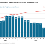 Die Inflationsrate, gemessen als prozentuale Veränderung des Verbraucherpreisindex für Bayern gegenüber dem entsprechenden Vorjahresmonat, liegt im November 2023 bei 2,8 Prozent. Für den Gesamtindex wird ein Wert von 117,6 berechnet, im Vormonat lag dieser noch bei 118,1. Dementsprechend sinken die Verbraucherpreise im November 2023 gegenüber dem Vormonat um 0,4 Prozent. Die Teuerungsrate des Gesamtindex ohne Nahrungsmittel und Energie, in der öffentlichen Diskussion oft als Kerninflationsrate bezeichnet, beläuft sich in diesem Monat auf 3,9 Prozent im Vergleich zum Vorjahresmonat.