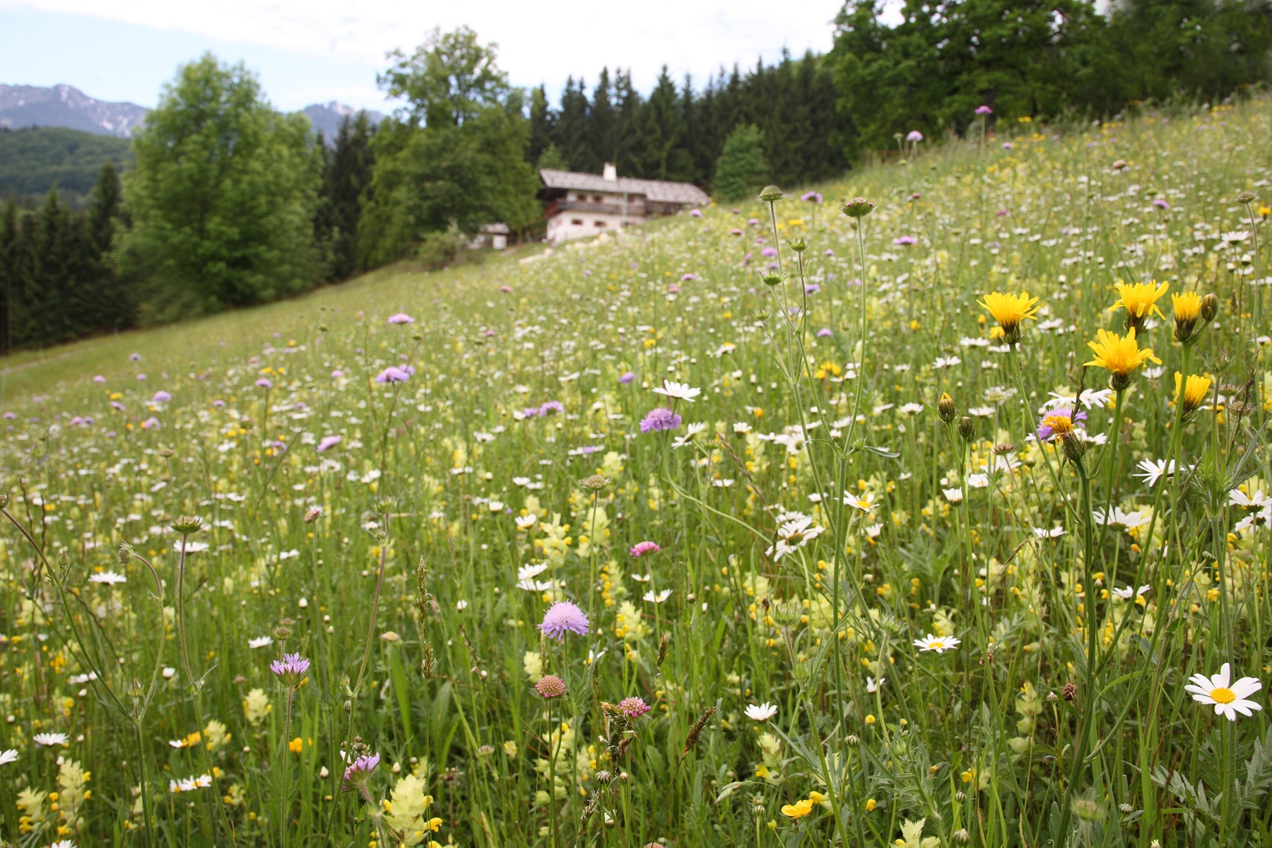 Die Buntheit dieser Wiese an der Glentleiten zeigt augenfällig den Reichtum an Flora und Fauna. Bildquelle: Bezirk Oberbayern, Archiv FLM Glentleiten, Foto: Nixdorf.