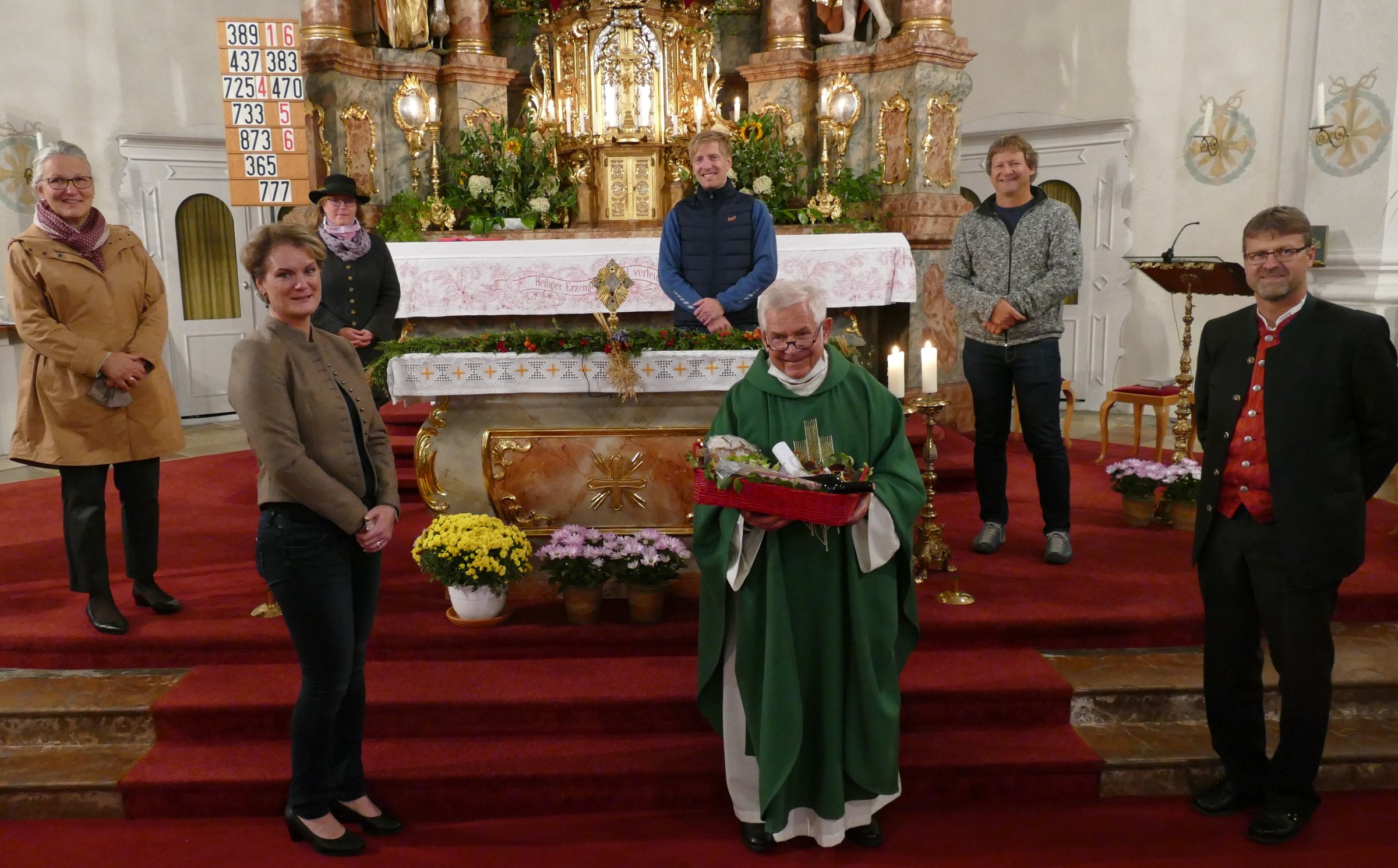 Ruhestandspfarrer Andreas Zehetmair wurde in der Inzeller Pfarrkirche vom Pfarrgemeinderat verabschiedet und bekam einen Geschenkkorb mit Inzeller Schmankerl überreicht. Hinten v.li. Hedi Schmid, Gabi Maier, Andreas Geisreiter und 3.Bürgermeister Richard Hütter. Vorne Andrea Gietl, Pfarrer Zehetmair und Pfarrgemeinderatsvorsitzender Albert Hütter.