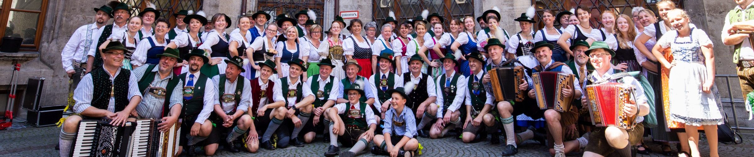 Der 01. Juni 2019 war ein besonderes Datum für die Trachtler des Isargaues. Nach genau 147 Planungstagen, zwei großen Gesamtproben und zahlreichen Proben innerhalb der Vereine war es endlich soweit: Der 1. Isargau Trachten-Flashmob ( = größere Menschenansammlung) wurde in München aufgeführt. Treffpunkt war der Innenhof des Rathauses am Marienplatz. Die Vorfreude war groß, und selbst einige der erfahrenen Tänzer waren nervös. Kein Wunder, denn einen Auftritt wie diesen gab es noch nie in der Geschichte des Isargaues. Nach letzten Absprachen und Vorbereitungen ging es dann in kleinen Gruppen zum Odeonsplatz. Bereits der erste Flashmob war ein voller Erfolg und gut besucht. Anschließend gab es noch zwei weitere am Marienplatz, die den ersten bei weitem an Zuschauern und Begeisterung übertrafen. Die Tänzer waren abwechselnd in Platter- und Volkstanzkreise aufgeteilt. In der Mitte standen die Musiker, die den Auftritt mit Ziach und Tuba tatkräftig begleitet haben.