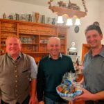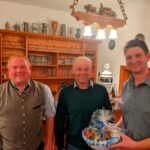 Bildunterschrift: Der Erste und wiedergewählte Vorstand Franz Schnaiter junior (rechts) überreicht Josef Moosmüller (Mitte) als Anerkennung für seine langjährige Tätigkeit einen Geschenkkorb. Auf der linken Seite ist der ebenfalls wiedergewählte Zweite Vorstand Lorenz Böglmüller.
