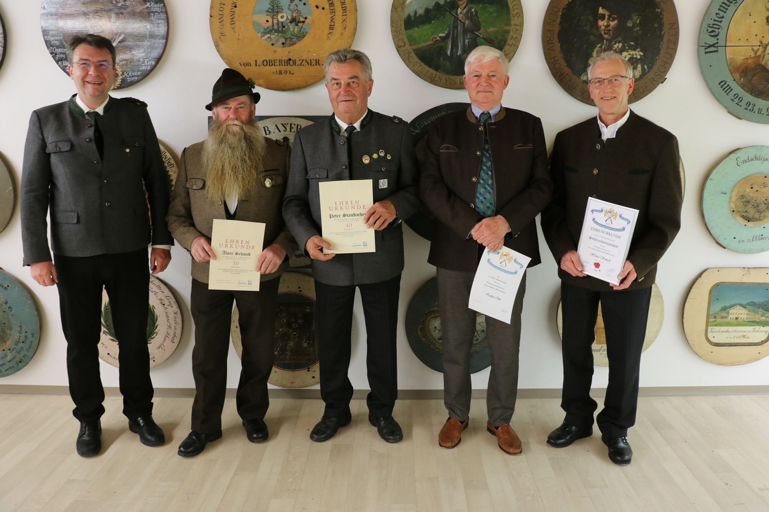 Ehrungen bei der Königlich privilegierten Feuerschützengesellschaft Aschau von 1607 (FSG Aschau). Schützenmeister Franz Kiesmüller verlieh Alois Schmid das Abzeichen für 50-jährige aktive Mitgliedschaft beim DSSB/BSSB, Peter Staudacher. Kaspar Öttl wurde für 40-jährige Vereinsmitgliedschaft geehrt und Heinz Scheck erhielt eine Dankurkunde für seine zehnjährige Tätigkeit als Schützenkommisar. (von links)