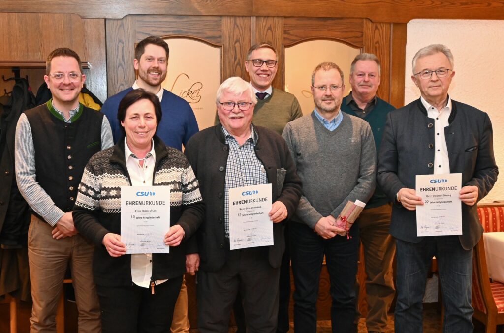 10 Jahre Mitglied in der Christlich-Sozialen Union in Bayern e.V. sind Gemeinderatsmitglied und ehemaliger Gemeinderatsfraktionssprecher Matthias Schweigl sowie Christine Haslreiter. 15 Jahre Mitglied sind Gemeinderatsmitglied sowie Stellvertretender Gemeinderatsfraktionssprecher Thomas Ager und der Vorsitzende des Ortsverbandes sowie Zweite Bürgermeister der Gemeinde Unterwössen Johannes Weber. 20 Jahre Mitglied ist Ehrenbürgerin, ehemaliges Gemeinderatsmitglied, ehemalige Stellvertretende Vorsitzende des Ortsverbandes und ehemalige Vorsitzende des Wössner Regenbogen e.V. Adelheid Meirer.