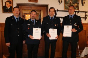 Josef Hobelsberger (zweiter von rechts) erhielt bei der Jahreshauptversammlung der Aschauer Feuerwehr im Café Pauli in Höhenberg das goldene Feuerwehrehrenzeichen des Freistaats Bayern für 40 Jahre aktiven Feuerwehrdienst, Bürgermeister Simon Frank (rechts) und Kommandant Tobias Brinkmann (zweiter von links) erhielten das Ehrenzeichen in Silber für 25 Jahre aktiven Feuerwehrdienst. Vorsitzender Werner Grill – Kommandant Tobias Brinkmann – Josef Hobelsberger – Bürgermeister Simon Frank (von links)