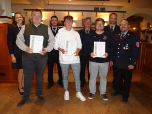 V.l.n.r. Lisa Weber (Erster Vorstand), Adrian-Razvan Weihnacht, Sebastian Weber jun. (stellv. Kommandant), Kilian Janson, Manfred Haider (stellv. Kommandant), Sebastian Henche, Benjamin Riedl (Zweiter Vorstand), Hans-Jürgen Oeckel (Erster Kommandant)
