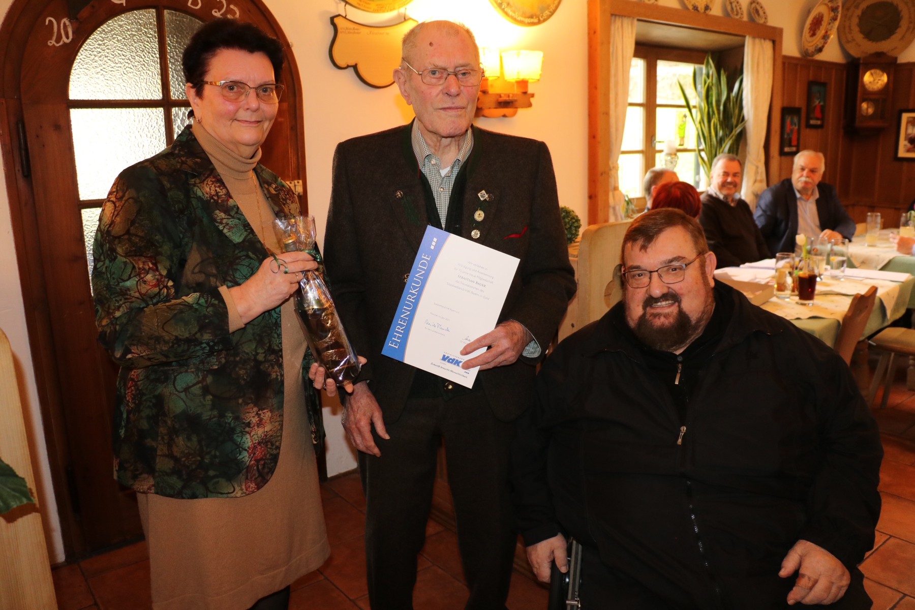 Die Vorsitzende des VdK-Ortsverbandes Aschau-Frasdorf Ursula Danner (links) überreicht zusammen mit dem Kreisvorsitzenden Hans Loy (rechts) das VdK-Treueabzeichen für 70-jährige aktive Mitarbeit an Sebastian Bauer aus Frasdorf (Mitte).