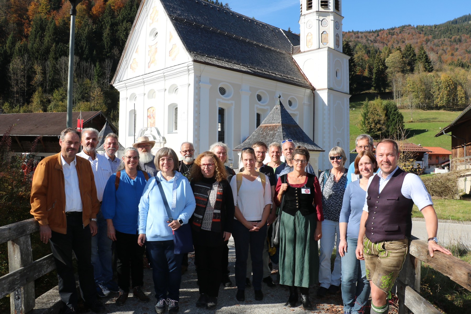 Die Verantwortlichen aus dem Arbeitsbereich Kirche und Tourismus in der Evangelischen Kirche Bayern bei ihrer Jahrestagung in Sachrang zusammen mit der Aschauer Pfarrerin Betina Heckner (zweite von rechts) und Tourismuschef Herbert Reiter (rechts) vor der neu renovierten Kirche Sankt Michael in Sachrang