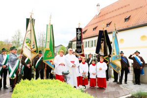 Pfarrer Hermann Overmeyer und der stellvertretende Vorstand des Trachtenvereins „D´ Lamstoana“ Frasdorf Andreas Kink gedenken beim Jahrtag des Frasdorfer Trachtenvereins der verstorbenen und gefallenen Vereinsmitglieder am Kriegerdenkmal in Frasdorf