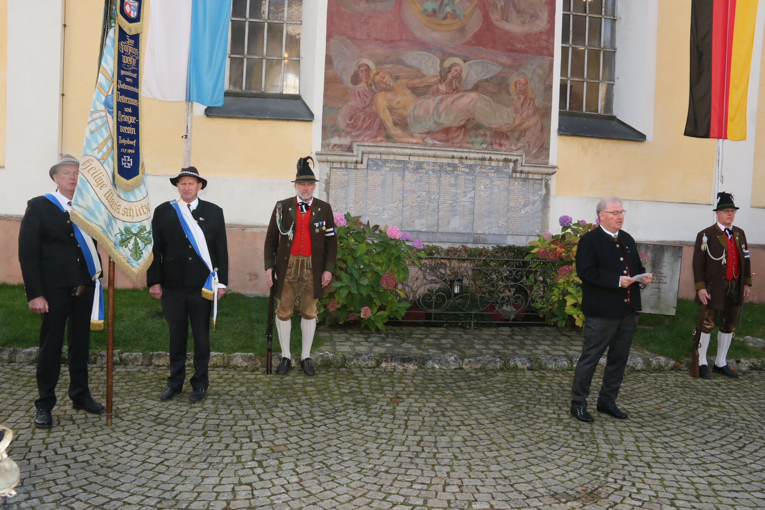 Vorstand Erich Rasinger gedenkt am Ehrenmal, begleitet von den Fahnen des Patenvereins Rohrdorf