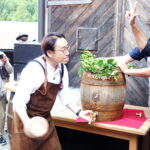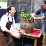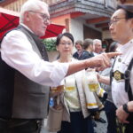 Schon gleich nach Bus-Ankunft und nach einem Chiemsee-Erlebnis-Tag wurden die Gäste aus Ichikawa mit Goaßlschnalzern des Trachtenvereins Hochries-Samerberg aus Grainbach begrüßt. Alsdann hieß Trachtenvorständin Ramona Sattlberger die inzwischen mit Rosenheimer Leuten vergrößerte Besucherschar willkommen und sie sagte: „Wir sind stolz, Euch auf dem Samerberg und beim Duftbräu willkommen heißen und Euch das zeigen zu dürfen, was bei uns gelernt wird und was bei uns der Brauch ist“. Alsdann luden die „Hoib-So-Oid-Musikanten“ Bürgermeister Koh Tanaka aus Ichikawa und Oberbürgermeister Andreas März von Rosenheim mit einem ersten Stück zum Bieranstich ein. Für Koh Tanaka war es eine Premiere, noch dazu in einer Lederhose und in bayerischer Tracht, die er am Vortag von den Rosenheimer Gastgebern als Begrüßungsgeschenk erhielt. Konzentriert und mit drei sicheren Schlägen wurde von ihm das Flötzinger-Faß angezapft.