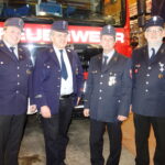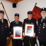 Bildbeschreibung: Eine Ehrenurkunde für 60-jährige Mitgliedschaft im Feuerwehrverein erhielten Thomas Speicher und Josef Mühlberger (in der Mitte von links) aus den Händen vom Vorstand Matthias Lengg (links) und von Kommandant Günther Braun. Weiteres Bild von der Ehrung für 40 Jahre aktiver Dienst bei der Freiwilligen Feuerwehr, von links Vereinsvorstand Matthias Schlechter, die Geehrten Franz Mühlberger und Alexander Hagl sowie Kommandant Günther Braun.