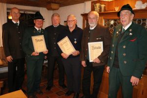 Ehrungen bei der KSK Sachrang: Gerd Kalckbrenner, Schriftführer KSK Sachrang – Franz Pfaffinger – Pius Graf, der Obmann der Interessengemeinschaft der Krieger- und Veteranenvereine und Soldatenkameradschaften im Landkreis Rosenheim (IG Rosenheim) – Helmut Pfaffinger – Christian Parigger – Ehrenvorstand Hans Pumpfer (von links)