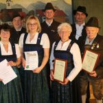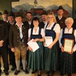 Gauschützenmeister Bernhard Brehmer übergab den beiden zusätzlich das Ehrenzeichen des bayerischen und des deutschen Sportschützenbundes für ihre 60-jährige aktive Vereinsmitgliedschaft. Kassenfrau Marianne Heinrich erhielt das Ehrenzeichen des Bezirks Oberbayern die Silberne Gams, Ilse Heinrich das Abzeichen des BSSB als Anerkennung ihrer Verdienste um den Verein, Sepp Heinrich das kleine Edelweiß in Silber für seine Verdienste um die Jugendarbeit. Den Chiemgauadler des Schützengaus in Silber steckte Gauschützenmeister Brehmer Schützenmeister Sepp Staudacher und Sportleiter Sepp Bauer an die Schützenjoppe. Das silberne Fahnenehrenzeichen des BSSB überreichte er an die Fahnenabordnung der „Chiemgauadler“ Sigi Steinberger, Florian Stein, Albert Pichl und Fridolin Pichl.