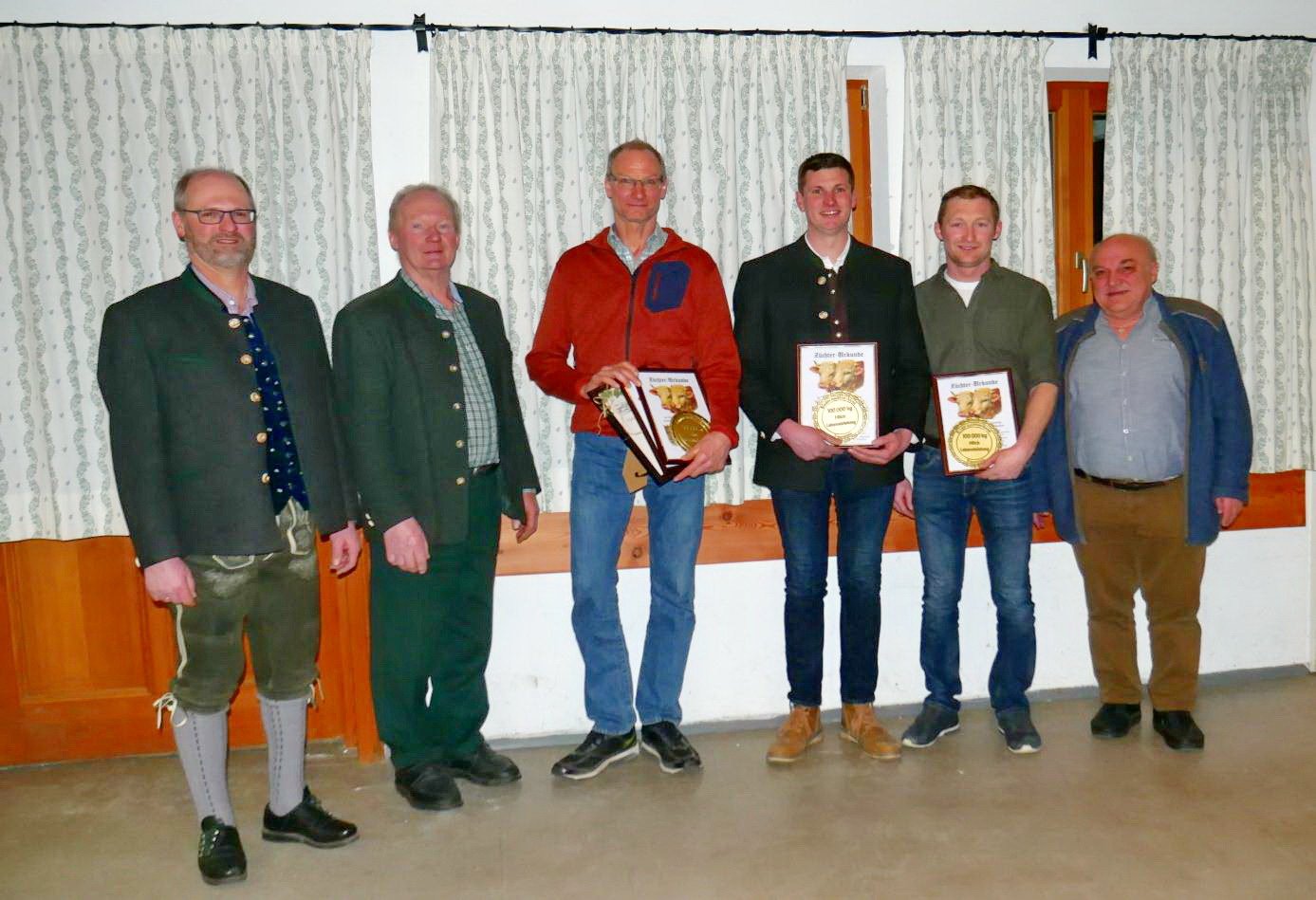 Ehrung für „100000 Liter Kühe“: v.l.n.r. 1. Vors. Johann Mayer, 2. Vors. Christoph Kaufmann, Christian Rappel, Josef Linner, Paul Stettner und Zuchtleiter Dr. Rudolf Maierhofer