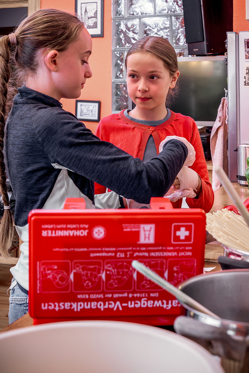 Eon Großvater kocht mit seinen Enkelinnen in der Küche und schneidet sich in die Hand. Die Mädchen versorgen den Großvater mithilfe eines Verbandkasten der Johanniter-Unfall-Hilfe e.V.