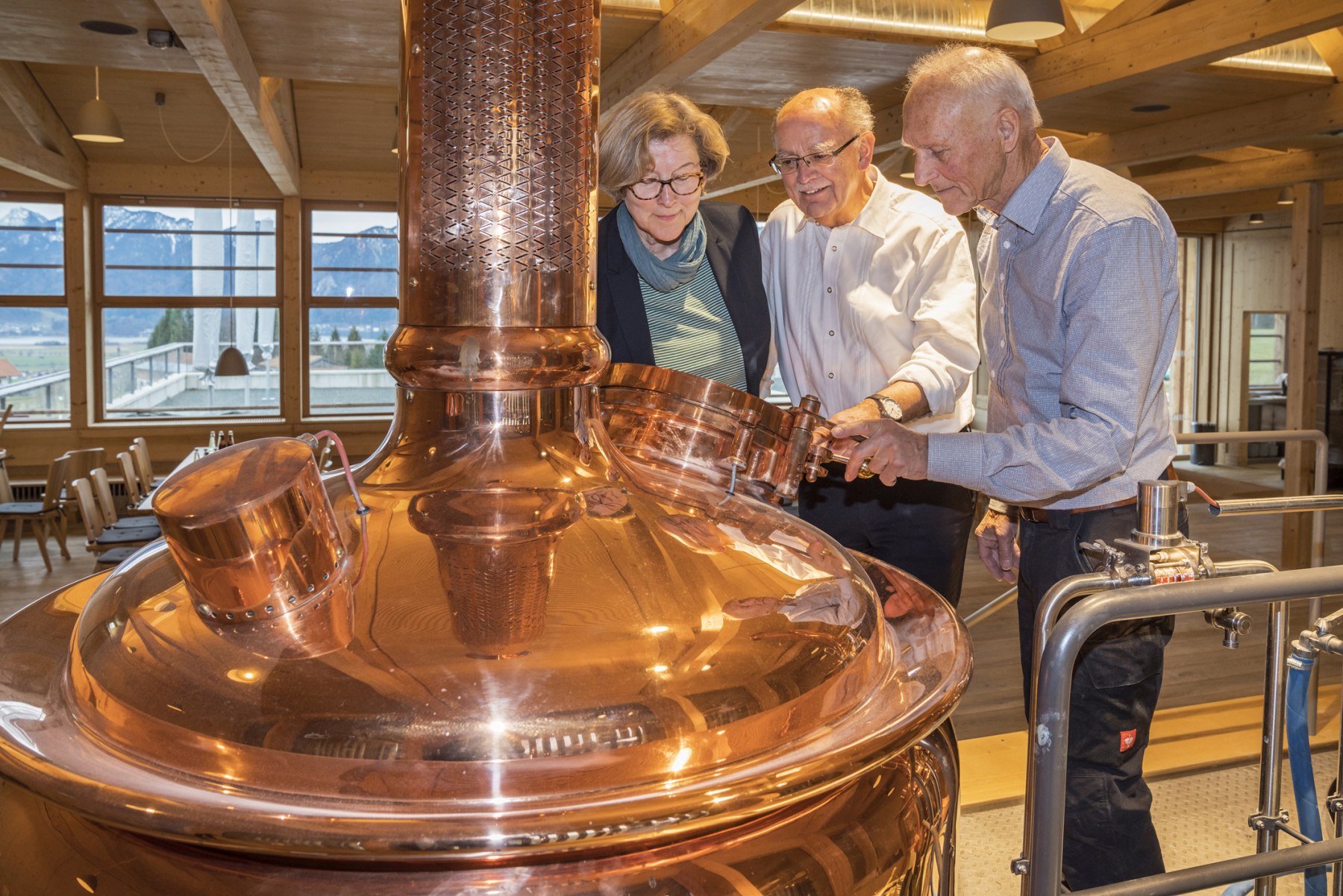 Museumsdirektorin Dr. Monika Kania-Schütz, Bezirkstagspräsident Josef Mederer und Braumeister Franz Schubert wachen über den Biersud, damit an Josefi wieder ein einzigartiges Bockbier ausgeschenkt werden kann.