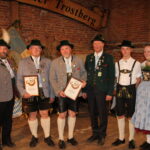 Der Höhepunkt des Abends waren jedoch die Ehrungen der beiden Vereinsmitglieder Sepp Freutsmiedl und Franz Mussner. Im Beisein von Michael Hauser durfte der Gebietsvertreter Hubert Dumpler den Jubilaren das „Goldene Gauehrenzeichen“ vom Gauverband I überreichen. Sepp Freutsmiedl, derzeit amtierender 1. Vorsitzender und Ehrenkassier der Alzviertler gehört 50 Jahre als aktives Mitglied dem Verein an. Bereits in jungen Jahren übernahm er das Amt des Vorplattlers, als Fähnrich und als 2. Kassier. Von 1984 bis 2010 orderte der Jubilar als 1. Kassier die Finanzen des Vereins, die er mit Sorgfalt verwaltete. Von Oktober 2013 bis 2018 wurde er zum 1. Vorsitzenden gewählt, anschl. unterstützte er die Vereinsführung bis 2022 als 2. Vorsitzender. Seit 2022 steht er nun wieder als 1. Vorsitzender an der Spitze des Alzviertler, der Verein wird von ihm bewährt und mit Engagement geleitet. Franz Mussner kann ebenfalls auf 50 Jahre Vereinszugehörigkeit zurückblicken. 1976 wurde er zum 2. Fähnrich gewählt, von 1980 bis 2010 trug er dann als 1. Fähnrich die Vereinsfahne mehr als 25 x nach Maria Eck, und durfte als Fahnenträger den Verein an unzähligen Trachtenfesten und sonstigen Veranstaltungen anführen. Von 2010 bis 2022 übernahm er als 1. Kassier die Finanzen des Vereins. Seit 2022 ist er als 2. Kassier im Vereinsausschuss tätig. Mit viel Erfahrung unterstützt er die Vereinsführung in jeglichen Angelegenheiten. Die Alzviertler als auch die Pallinger Aktiven ehrten die beiden Jubilare im Anschluß mit dem Kronentanz, dem Zwoasteyrer und einigen gemeinsamen Plattlern.