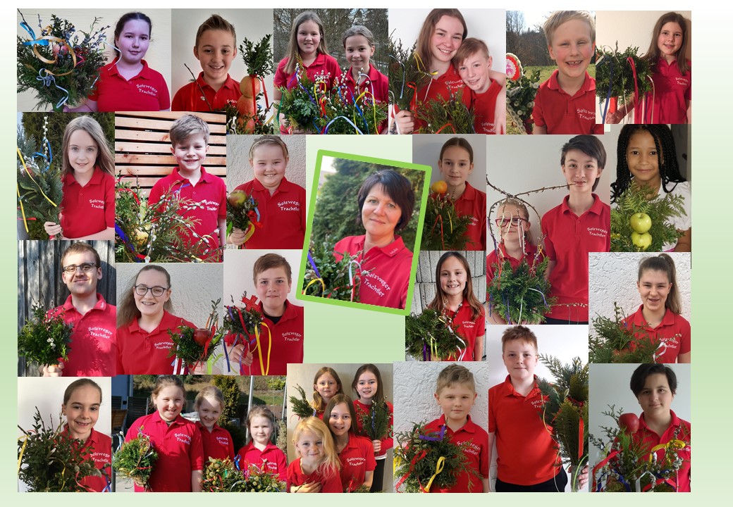 Stolz präsentiert die Jugend des Trachtenvereins Salzweg ihre Palmbuschen und …