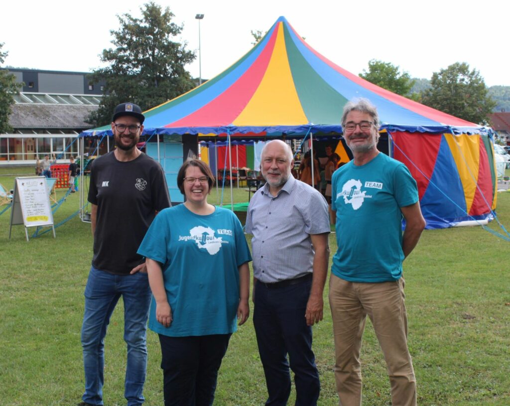 Bürgermeister Stefan Scheibenzuber besuchte die JugendkulTour und überzeugte sich vom umfangreichen Angebot. Im Gespräch mit Kreisjugendpflegerin Maria Kunschert, KJR-Geschäftsführer Helmut Lipfert und Gemeinderat Matthias Klimm bestätigte er, welche Bereicherung solche Veranstaltungen für Kinder und Jugendliche sind. So bat er Laura Wisniewsky, die das DemokratieMobil des Kreisjugendrings vor Ort vorstelle, um die Ergebnisse der Umfragen unter den Jugendlichen und lud ein, diese in einer Gemeinderatssitzung vorzustellen.