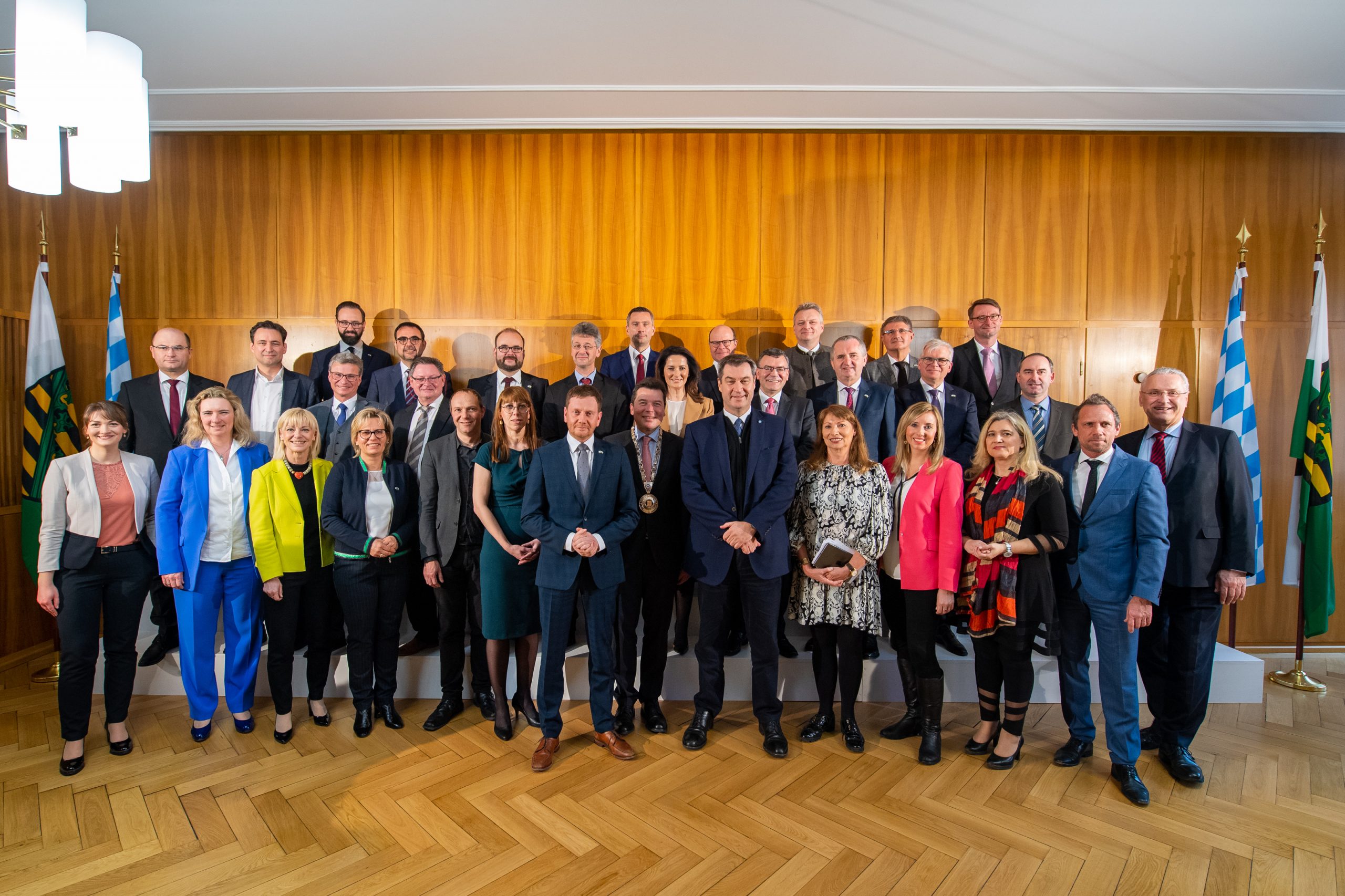 Gruppenbild mit den Mitgliedern des Bayerischen Kabinetts und des Kabinetts des Freistaates Sachsen sowie dem Hofer Oberbürgermeister Dr. Harald Fichtner (Mitte) im Rathaus der Stadt Hof.