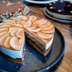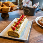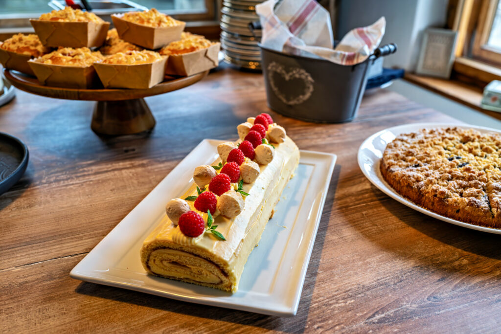 Doch das wahre Highlight des Nachmittags waren die süßen Kunstwerke, die Veronique Witzigmann den Gästen darbot. Ein Tisch gedeckt mit Torten, Kuchen und Gebäck, die nicht nur in Geschmack, sondern auch in ihrer Präsentation beeindruckten. Jede Kreation war ein kleines Kunstwerk für sich, liebevoll dekoriert und mit einer solchen Perfektion gestaltet, dass man sie fast nicht anschneiden wollte. Doch der köstliche Duft war zu verlockend, und so ließen wir uns von der Vielfalt verführen. Die Geschmacksreise begann mit einer Apfel-Joghurt-Marzipan-Torte, und ging weiter mit einer Topfen-Torte mit Marillenmarmelade, einen Zwetschgen-Streusel-Kuchen, eine Bisquitroulade mit Eierlikörcreme und Zwetschge, eine Sauerrahm-Frischkäse-Torte mit Johannisbeerspiegel, einen Buttermilch-Rührkuchen mit Streusel und Himbeere und eine Torte von Schokolade mit Schokolade (Schokoladenböden und Schokoladencreme gefüllt).