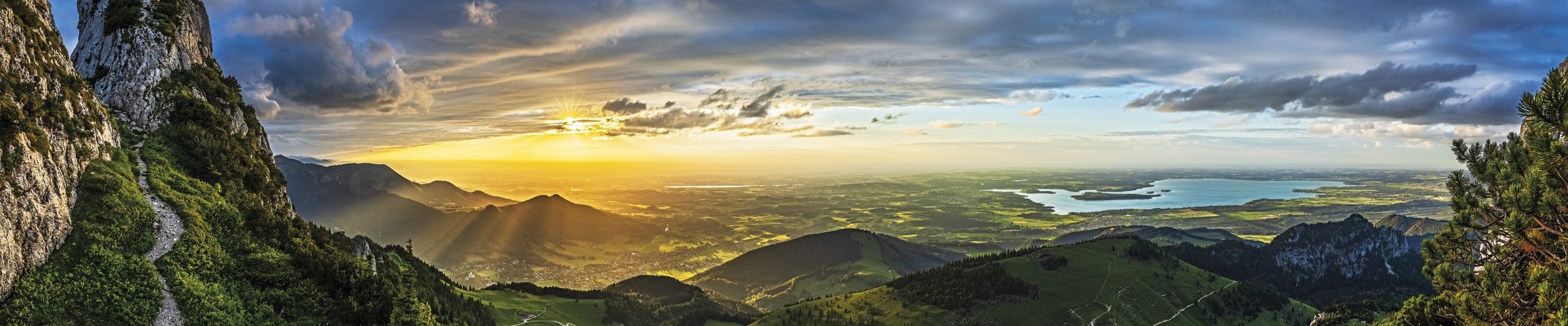 Ein herrlicher Tag neigt sich dem Ende zu. Die Panoramaaufnahme zeigt den Blick von der Kampenwand gegen Westen im weichen Abendlicht. Der Chiemsee, das bayerische Meer in seiner vollen Größe liegt dem nördlichen Alpenrand zu Füßen.