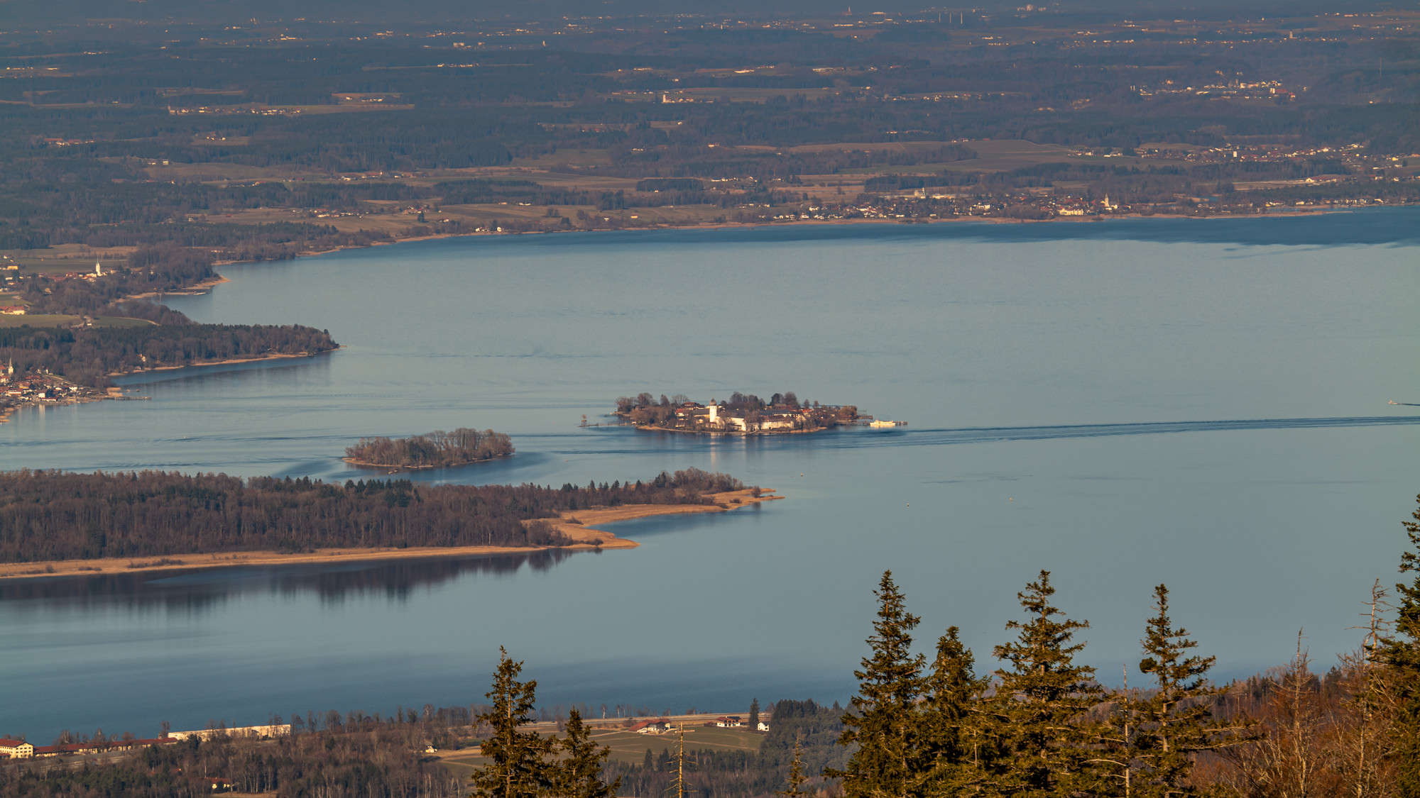 Von der Gondel der Kampenwandbahn: Blick auf die Fraueninsel