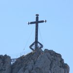 Im Sommer 1950 gingen die Arbeiten weiter. Jeder Zentner Zement, jedes Schalungsbrett, Geräte zum Schweißen, Werkzeug, Baumaterial, Wasser – alles musste per Hand und Rücken auf den Gipfel geschafft werden. 416 Zentner Material sollen es insgesamt gewesen sein. Das dauerte Wochen, denn der Einsatz war freiwillig und jeder half dann, wenn er Zeit hatte. So habe er, erzählte der Schaffner Franz, als oben betoniert wurde, an einem Tage 13 mal von der Steinlingalm jeweils einen halben Zentner Zement zum Gipfel geschleppt; der Hell Hermann sei sogar 14 mal gelaufen. Probleme bereitete der Fels, in den es Fundamente und Befestigungen zu graben galt – ohne Schlagbohrer, Kompressor oder andere mechanische Hilfsmittel! Das Fundament und die Löcher für die Verankerung wurden aus dem Gestein herausgemeißelt und der gewichtige Sockel aus Panzerstahl einbetoniert. Das Kreuz musste an Ort und Stelle zusammengeschweißt werden, erst dann konnte es mit vereinten Kräften in die Senkrechte gebracht werden.