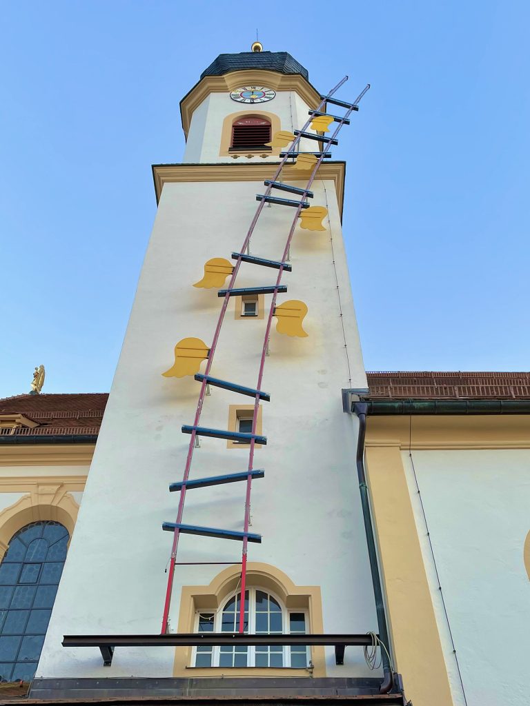 Das Heilige Grab von Aschau wird im Kirchenraum bis 24. April zu sehen sein, am Nordturm leuchtet die „Himmelsleiter“ bis 20. November. Das 28 Meter hohe Lichtobjekt, das der Gaißacher Künstler Erwin Wiegerling geschaffen hat, war bereits seit dem Jahr 2000 an vielen Orten in Deutschland zu sehen und wird nun erstmals im Landkreis Rosenheim gezeigt. Mit den zwölf Leitersprossen und sieben Engelsflügeln liegt dem Projekt die Vision des biblischen Jakob von der Himmelsleiter zugrunde. Sie wird durch ein Rahmenprogramm und einen neuen Meditations- und Skulpturenweg verschiedener Gruppen und Künstler ab Pfingstsamstag 2022 rund um die Aschauer Kirche ergänzt. Die Präsentation von Heiligem Grab und Himmelsleiter ist ein Gemeinschaftsprojekt der Pfarrei, des Heimat- und Geschichtsvereins Aschau sowie der politischen Gemeinde Aschau im Chiemgau mit der Tourist Info.