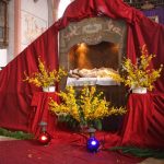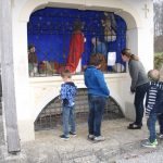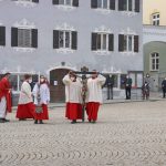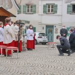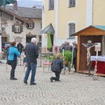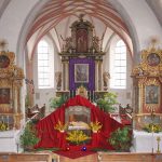 Die Verantwortlichen zusammen mit Pfarrer Christoph Rudolph haben vor allem für die Kinder das Ostergeschehen in Neubeuern eindrucksvoll an verschiedenen Station vorbereitet. Mit Gebetszetteln, kleinen Gaben, Kerzen waren die Stationen ausgestattet. Ein Bibeltext beschrieb das Geschehen, so an einem Feldkreuz, wo zu Fronleichnam der Altar aufgebaut ist oder an der Ölbergkapelle am Friedhof oder am Tisch beim letzten Abendmahl aufgebaut vor der Leichenhalle sowie beim Heiligen Grab in der Kirche von Altenbeuern. Im Familienverbund konnten die einzelnen Stationen besucht werden. So war auch ein enger Kontakt ausgeschlossen. Am Marktplatz waren für die Erwachsenen die Vorbereitungen getroffen worden zur Karfreitags-Liturgie. Der Altardienst mit Pfarrer Chirstoph Rudolph und eine kleine Gruppe des Kirchenchores nahmen vor dem Kriegerdenkmal Aufstellung, die überschaubare Kirchengemeinde fand sich auf dem weiten Rund am unteren Marktplatz und um den Marktbrunnen ein. Stellvertretend für die Kirchenbesucher nahmen während der Messfeier Vertretrer von Kirchenverwaltung und Pfarrgemeinderat sowie Lektoren und der Altardienst die Kreuzverehrung vor. Das Kreuz blieb auch nach dem Gottesdienst im Altarbereich zur persönlichen Verehrung.