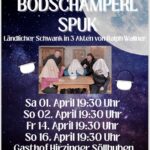 Gespielt wird das Stück „Bodschamperlspuk“ von Ralph Wallner am 01., 02., 14. und 16. April um jeweils 19:30 Uhr. Einlass und Bewirtung findet ab 18 Uhr statt. Es gibt auch noch Restkarten. Diese können bei Gasthof Hirzinger unter der Telefonnummer 08036/1266 reserviert werden.