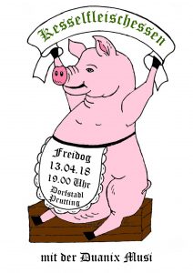 Der Trachtenverein Prutting lädt am Freitag, 13. April ab 19 Uhr herzlich zum Kesselfleischessen in den Pruttinger Dorfstadl ein. Zur Unterhaltung spielt die Duanix Musi auf. Unsere Kinder- und Jugendgruppe und die Aktiven des Vereins tragen mit ihren Auftritten ebenso zum guten Gelingen bei. Der Eintritt ist frei. Wir freuen uns auf zahlreiche Besucher und einen schönen, gemeinsamen Abend.