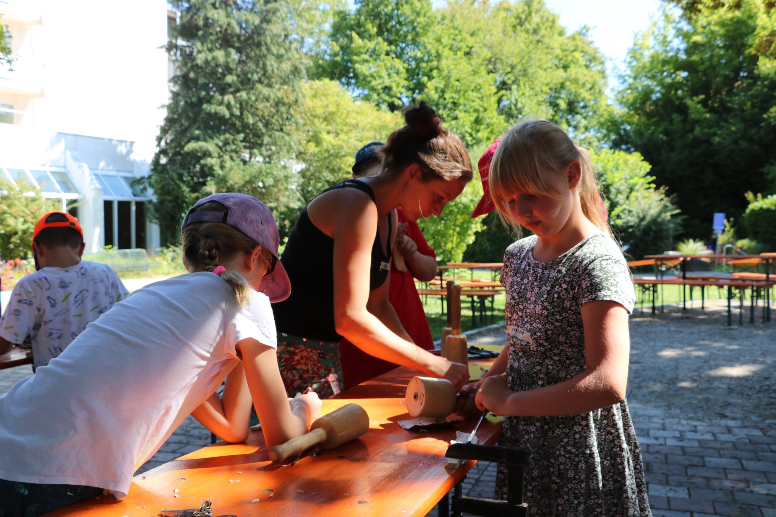 Behutsam setzen die jungen Teilnehmer:innen von „Kinder machen Kunst“ das Schnitzeisen an, dabei steht ihnen die Holzbildhauerin Franziska Bürger unterstützend zur Seite.